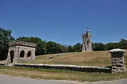 The Winchester Soldiers' Monument is located in a residential area north of the commercial Main Street area of Winsted, at the southern end of Crown Street. The park in which it is set is atop a circular hill, which is grassed down to the park drive, paths and a few trees dotting its interior. A low stone retaining wall lines the parking area on Crown Street. A square entrance arch with crenellated top provides access to one of the paths leading to the main monument. The main structure is a three-level tower built of ashlar granite from a local quarry, and is square in footprint. Its walls slope inward in the lower stage to eventually straighten and are crowned by crenellations. At one corner a circular tourelle projects from the third level, topped by a bronze figure of a soldier holding colors. There is a single entrance on one face, with single windows on each of the other first-floor facades, and two windows on each of the upper levels. The total height of the tower is 44 feet (13 m).[2]