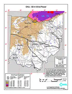 ![]() Average annual wind power density map for Ohio at 50m above ground | |||||||||||||||||||||||||||||||||||||||||||||||||||||||||