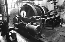 The first powered winding engines were stationary steam engines. The demand for winding engines was one factor that drove James Watt to develop his rotative beam engine, with its ability to continuously turn a winding drum, rather than the early reciprocating beam engines that were only useful for working pumps.[2]