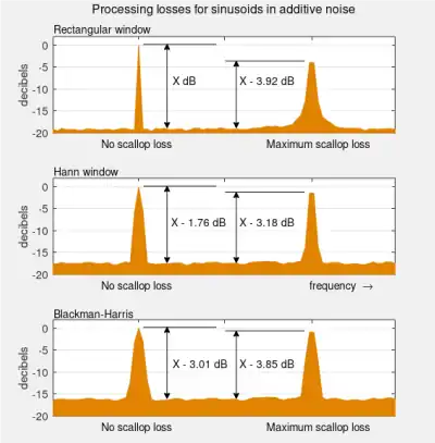 Figure 3 depicts the effects of three different window functions on the same data set, comprising two equal strength sinusoids in additive noise. The frequencies of the sinusoids are chosen such that one encounters no scalloping and the other encounters maximum scalloping. Both sinusoids suffer less SNR loss under the Hann window than under the Blackman–Harris window. In general (as mentioned earlier), this is a deterrent to using high-dynamic-range windows in low-dynamic-range applications.