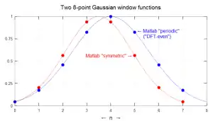 The formulas provided in this article produce discrete sequences, as if a continuous window function has been "sampled". (See an example at Kaiser window.) Window sequences for spectral analysis are either symmetric or 1-sample short of symmetric (called periodic,[7][8] DFT-even, or DFT-symmetric[9]:p. 52). For instance, a true symmetric sequence, with its maximum at a single center-point, is generated by the MATLAB function hann(9,'symmetric'). Deleting the last sample produces a sequence identical to hann(8,'periodic'). Similarly, the sequence hann(8,'symmetric') has two equal center-points.[10]