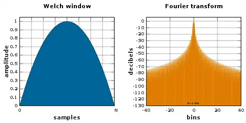 In signal processing and statistics, a window function (also known as an apodization function or tapering function[1]) is a mathematical function that is zero-valued outside of some chosen interval, normally symmetric around the middle of the interval, usually near a maximum in the middle, and usually tapering away from the middle. Mathematically, when another function or waveform/data-sequence is "multiplied" by a window function, the product is also zero-valued outside the interval: all that is left is the part where they overlap, the "view through the window". Equivalently, and in actual practice, the segment of data within the window is first isolated, and then only that data is multiplied by the window function values. Thus, tapering, not segmentation, is the main purpose of window functions.