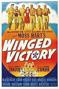 Winged Victory is a 1944 American drama film directed by George Cukor, a joint effort of 20th Century-Fox and the U.S. Army Air Forces.[2] Based upon the 1943 play of the same name by Moss Hart, who also wrote the screenplay, the film opened only after the play's theatre run. The film version of Winged Victory used many of the Broadway cast, who were brought to Hollywood.[3]