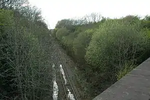 Winslow station continued to be used during the 1980s for "Chiltern Shopper" specials and British Rail handbills survive which show that services called at the station during November and December between 1984 and 1986.[5] The station building, which was by then in a very derelict state, survived long enough to see the first visit of a Class 43 on 13 February 1993, but was demolished very shortly afterwards.[35][36] The line between Claydon and Bletchley through Winslow was closed and mothballed in May 1993 following the closure of the ARC stone terminal at Wolverton which had provided the line's last source of traffic.[37] The last train over the section was a Class 56 railtour called "The Mothball" which ran on 29 May 1993 from Waterloo to Bletchley via Winslow.[37] Winslow station site was later developed for housing.[38] The platforms remain in an overgrown and degraded state.[39]
