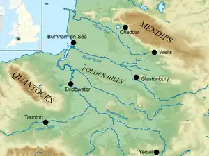 The Levels occupy an area of about 160,000 acres (650 km2), bisected by the Polden Hills; the areas to the south are drained by the River Parrett, and the areas to the north by the rivers Axe and Brue. The Somerset Levels consist of marine clay "levels" along the coast, and inland (often peat-based) "moors"; agriculturally, about 70 percent is used as grassland and the rest is arable. Willow and teazel are grown commercially and peat is extracted. The Levels are about 20 feet (6 m) above mean sea level (O.D.). The general elevation of water is 10 to 12 feet (3 to 4 m) O.D.[2] The area's topography consists of two basins mainly surrounded by hills, the runoff from which forms rivers that originally meandered across the plain but have now been controlled by embanking and "clyses" (the local name for a sluice).[3]