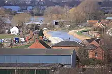 An earth bank at Huntworth was hastily built, connecting the canal bank to the railway embankment and the embankment to the river wall. This was to prevent any flooding from reaching the outskirts of Bridgwater. Some of the Dutch pumps were located behind it at Newhouse Farm to pump any water away.[56]