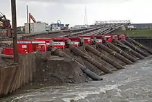 In the middle of February 2014, the Environment Agency began installing giant pumps imported from the Netherlands to alleviate the continuing flooding.[57] A Dutch team of engineers had arrived in at a sluice at Bridgwater with more than 20 lorries full of kit and pumps to help with the flood relief effort in Somerset on 12 February.[58] By 21 February 8 high-output pumps located at Dunball were starting to lower the level in King's Sedgemoor Drain allowing floodwater-from the upper Parrett to reach it by way of the Sowy River. The water is pumped into the tidal river Parrett for several hours on either side of a high tide. At low tide the water drains through the sluice gates at Dunball by gravity. The Monks Leaze Clyse, near Langport was gradually opened on Saturday 22 February, allowing the operation to start.[59] The pumps at Dunball drew water out of the King's Sedgemoor Drain into the River Parrett at a rate of 56,000 m3 every hour.[60]