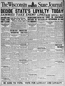 During the 1890s the paper's circulation began to catch up to its main rival, the Madison Democrat, due largely to the 1894 arrival of Yale-educated Amos Parker Wilder (father of playwright Thornton Wilder). Earning $30 a week as editor-in-chief, he later purchased a major interest in the paper.[10] Wilder began to transform the State Journal into a more civic-minded newspaper, focusing on local problems but falling short of embarking on crusades. Originally a supporter of Governor Robert M. La Follette Sr. in 1900 and 1902, Wilder converted the paper's editorials to an anti-La Follette position for the price of $1,800, paid by a committee of seven Republican stalwarts fighting against La Follette's ultimately successful re-election in 1904.[11] In 1906 President Theodore Roosevelt appointed Wilder U.S. consul to Hong Kong.