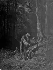 In medieval chivalric romance and modern fantasy literature, he is often presented as a wizard.[2] He can also or instead be featured as a hermit. This character type often explained to the knights or heroes—particularly those searching for the Holy Grail—the significance of their encounters.[3]
