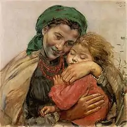 In 1899 he went to study painting at the École nationale supérieure des Beaux-Arts in Paris. In 1902 he had his first showings in an exhibition by the "Sztuka" society. Further exhibitions followed in Munich, Amsterdam, Rome, Berlin, Prague, Vienna, and Warsaw. In 1904 he painted the first of his village (or peasant) "Madonnas".[1] In 1905 he started the cycle of pictures called "Confession" which brought him international recognition. In 1907 he was the first Polish painter to be made a member of the Gallery of the Vienna Secession. When his professor, Jacek Malczewski, was appointed the Rector of the Kraków Academy of Fine Arts in 1912, Hofman obtained a teaching post there. With the outbreak of World War I, in 1914–1920 he lived in Prague and then in Paris, marrying his beloved Ada in 1919.[2] Back in Kraków in 1921, he and his wife lived in a villa on Spadzista Street, later renamed Hofman Street in his honour. Sometime around 1922, influenced by his friendship with Jacek Malczewski, he changed the spelling of his name from Czech to a Polonised 'Wlastimil'. Malczewski died in 1929. Hofman's work was also part of the painting event in the art competition at the 1928 Summer Olympics.[3]