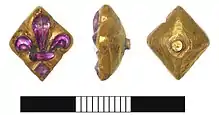 - a 1400 to 1550 gold brooch/pin set with a fleur de lys made from amethyst (an inlay).[7]