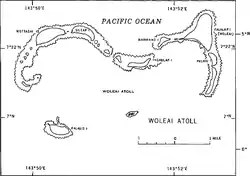 Woleai, also known as Oleai,[1] is a coral atoll of twenty-two islands in the eastern Caroline Islands in the Pacific Ocean, and forms a legislative district in the Yap State in the Federated States of Micronesia and is located approximately 57 kilometres (35 mi) west-northwest of Ifalik and 108 kilometres (67 mi) northeast of Eauripik. Woleai is also the name of the largest of the islets constituting the atoll, lying to the northeast.