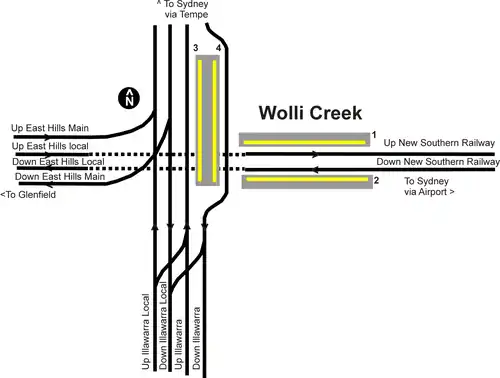 Wolli Creek railway station is located at the junction of the Airport and Illawarra lines, serving the Sydney suburb of Wolli Creek. It is served by Sydney Trains T4 Illawarra line, T8 Airport & South line services and NSW TrainLink South Coast line services.