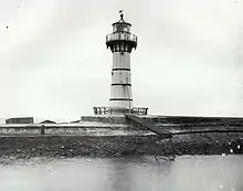 Designed by Edward Orpen Moriarty MA MInstCE, the Engineer-in-Chief of Harbours and Rivers Department, the tower is constructed of wrought iron on a ferro-concrete base to survive any gale force weather in the area. It is one of the two towers in New South Wales made from wrought iron plates—another identical one, Warden Head Light, was built at Ulladulla Breakwater which later moved to Warden Head.[3] Its construction was delayed by heavy seas which the tower did survive through. Until the lighthouse came into service, a temporary red light was fixed in a box at the end of the pier. Its lantern was installed in July 1871 but its light was not exhibited regularly until January 1872.[2]