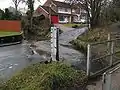 The Wom Brook at Rushford Bridge, where it enters the village under the old Stafford-Worcester Road. St Benedict Biscop's church and the village centre are visible in the background.