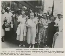 The NACW raised more than $5 million in war bonds during World War I.[70] The Woman's Club of Norfolk wrote letters and sent care packages to the segregated black units sent to fight overseas.[71] During the Great Depression, black women's clubs began to move towards "structural change and electoral politics".[72] The National Council of Negro Women (NCNW) became a dominant group in the women's club movement in African-American circles.[72] After World War II, working class and poor black women took the place of upper-class black women in organizing communities.[73]