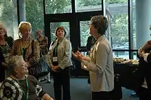 The woman's club movement became part of Progressive era social reform, which was reflected by many of the reforms and issues addressed by club members.[3] Many women's clubs focused on the welfare of their community because of their shared experiences in tending to the well-being of home-life, according to Maureen A. Flanagan.[4] Tending to the community was often called "municipal housekeeping" during the Progressive era and reflected a shared belief by many club members that home and city life were linked through city hall.[5] By constructing the idea of municipal housekeeping, women were also able to justify their involvement in government.[6] Later, in 1921, Alice Ames Winter describes how women had begun to see "their homes as the units out of which society was built", and that home life and public life were linked.[7] Women's clubs "established the idea that women had a moral duty and responsibility to transform, define and shape public policy".[8] Women's clubs were also "training schools" for women who wanted to get involved in the public sphere.[9] They helped women attain both social and political power.[10]