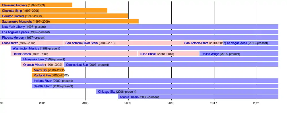 The WNBA began with eight teams: the Charlotte Sting, Cleveland Rockers, Houston Comets, and New York Liberty in the Eastern Conference; and the Los Angeles Sparks, Phoenix Mercury, Sacramento Monarchs, and Utah Starzz in the Western Conference.[3]