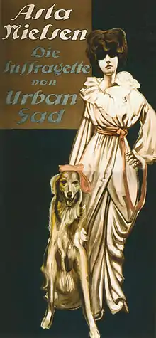 Die Suffragette (1913, English: The Suffragette), also released as The Militant Suffragette, starred Asta Nielsen as a British suffragette who becomes involved in a plot to murder a politician. The film was distributed in Germany, America, England, Brazil, and Sweden.[11]