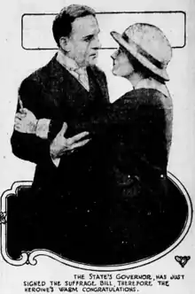 Florence Lawrence participated in the Woman suffrage parade of 1913 on horseback, where she was filmed in Kinemacolor.[11] Screenwriter Frances Marion participated in the October 23, 1915 parade that brought more than 30,000 supporters of women's suffrage onto the streets of New York City.[34] Actress Fan Bourke opened The Princess, a 500-seat "votes for women" movie theatre, in New Rochelle, New York in late 1915.[11]