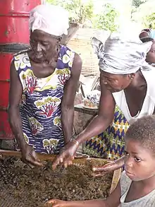 Today, women make up 43.1% of economically active population in Ghana, the majority working in the informal sector and in food crop farming.[17] In crop farming, women the majority of women work in weeding, planting, and selling food crops.[23] About 91% of women in the informal sector experience gender segregation and typically work for low wages.[17] Within the informal sector, women usually work in personal services. There are distinct differences in artisan apprenticeships offered to women and men, as well. Men are offered a much wider range of apprenticeships such as carpenters, masons, blacksmiths, mechanics, painters, repairers of electrical and electronic appliances, upholsters, metal workers, car sprayers, etc. In contrast, most female artisans are only involved in either hairdressing or dressmaking.[17] Women generally experience a disparity in earnings, receiving a daily average of 6,280 cedis compared to 8,560 cedis received by men according to the Ghana Living Standards Survey.[17]