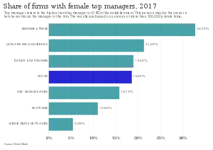 As of 2014, nearly 60% of 22,000 global firms had no female board members, a little over half had no female C-suite executives, and less than 5% had a female CEO.[10] However, there is substantial variation amongst different countries: Norway, Latvia, Bulgaria, and Slovenia had at least 20% female representation in senior executives and board members while Japan had only 2% female representation in board members and 2.5% female representation in C-suite executives.