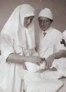 Women's participation in the medical professions was generally limited by legal and social practices during the decades while medicine was professionalizing.[44] Women openly practiced medicine in the allied health professions (nursing, midwifery, etc.), and throughout the nineteenth and twentieth centuries, women made significant gains in access to medical education and medical work through much of the world. These gains were sometimes tempered by setbacks; for instance, Mary Roth Walsh documented a decline in women physicians in the US in the first half of the twentieth century, such that there were fewer women physicians in 1950 than there were in 1900.[45] Through the latter half of the twentieth century, women made gains generally across the board. In the United States, for instance, women were 9% of total US medical school enrollment in 1969; this had increased to 20% in 1976.[45] By 1985, women constituted 16% of practicing American physicians.[46]