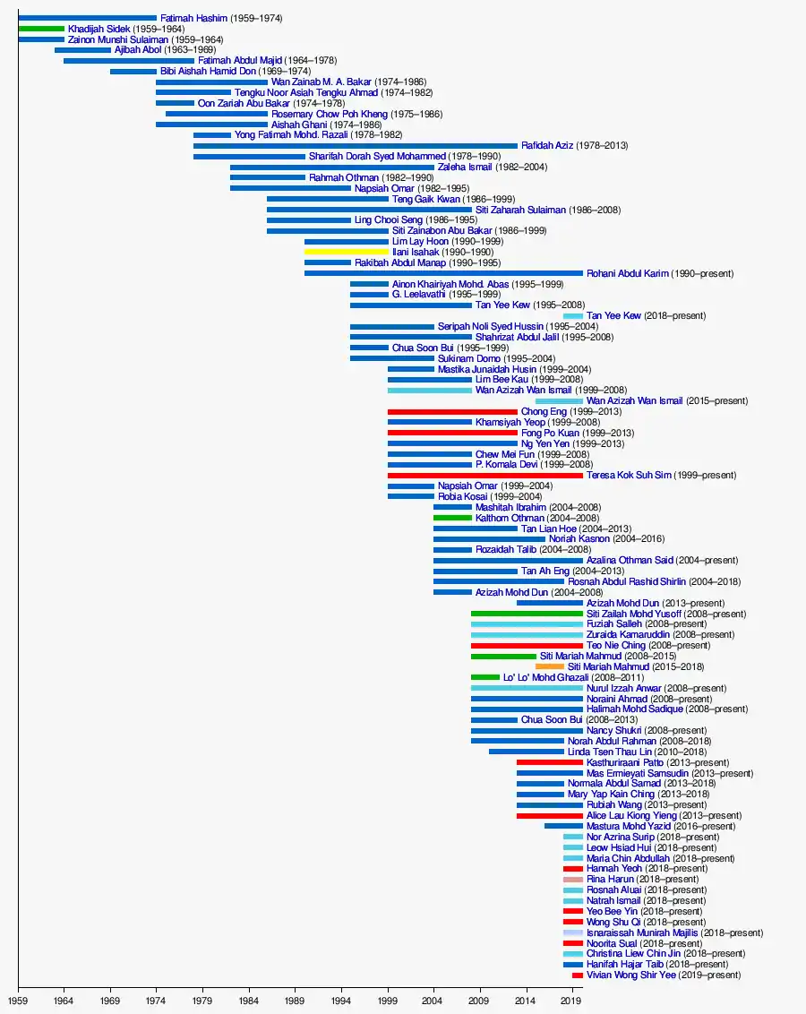 Women have had the right to both vote and sit in parliament since 1959 and all states and territories have been represented by a woman in the Dewan Rakyat.[2][3][4]