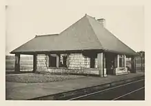 The B&A commissioned buildings from H.H. Richardson for three new stops at Boylston Street, Beacon Street, and Washington Street (later called Woodland) in October 1884. The three stations were built in largely unoccupied areas of Newton, and the attractive architecture was intended to bring in new residents who would become paying customers of the railroad.[1] By this time, Richardson was in failing health; his successors Shepley, Rutan and Coolidge may have done most of the design work. Construction by the Norcross Brothers firm began in June 1886—two months after Richardson's death—and finished that September.[1] Similar to the other stations on the line, it was built in the heavy stone Richardsonian Romanesque style with a dominant roofline. The corners facing the tracks were cut back to serve as porches.[1]