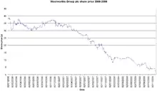 On 26 November 2008, trading of shares in Woolworths Group was suspended, and its Woolworths and Entertainment UK subsidiaries entered administration.[6] Deloitte closed all 807 Woolworths stores between 27 December 2008 and 6 January 2009, resulting in 27,000 job losses.[7] Woolworths Group plc entered administration on 27 January 2009,[8] and it was officially dissolved on 13 October 2015.[9]