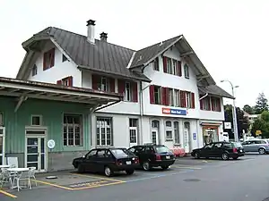 Worb Dorf railway station (German: Bahnhof Worb Dorf) is a railway station in the municipality of Worb, in the Swiss canton of Bern. It is the eastern terminus of the 1,000 mm (3 ft 3 3⁄8 in) gauge Worb Dorf–Worblaufen line of Regionalverkehr Bern-Solothurn. The station is located in the city center; another station, Worb SBB, is located 1.8 kilometres (1.1 mi) south on the standard gauge Bern–Lucerne line of Swiss Federal Railways.