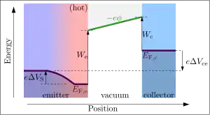 where Wc is the collector's thermionic work function, ΔVce is the applied collector–emitter voltage, and ΔVS is the Seebeck voltage in the hot emitter (the influence of ΔVS is often omitted, as it is a small contribution of order 10 mV). The resulting current density Jc through the collector (per unit of collector area) is again given by Richardson's Law, except now