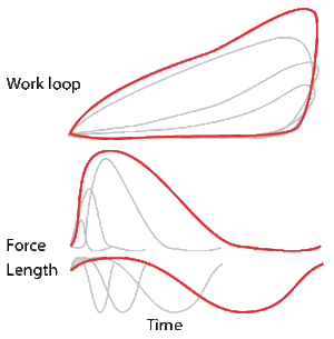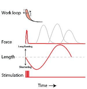 To simulate the rhythmic shortening and lengthening of a muscle (e.g. while moving a limb), a servo motor oscillates the muscle at a given frequency and range of motion observed in natural behavior. Simultaneously, a burst of electrical pulses is applied to the muscle at the beginning of each shortening-lengthening cycle to stimulate the muscle to produce force. Since force and length return to their initial values at the end of each cycle, a plot of force vs. length yields a 'work loop'. Intuitively, the area enclosed by the loop represents the net mechanical work performed by the muscle during a single cycle.