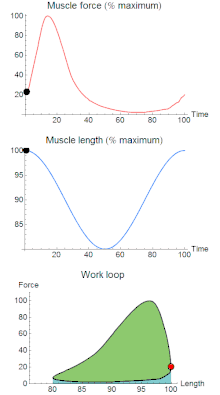 A work loop combines two separate plots: force vs. time and length vs. time. When force is plotted against length, a work loop plot is created: each point along the loop corresponds to a force and a length value at a unique point in time. As time progresses, the plotted points trace the shape of the work loop. The direction in which the work loop is traced through time is a critical feature of the work loop. As the muscle shortens while generating a tensile force (i.e. "pulling"), then, by convention in, the muscle is said to be performing positive work during that phase. As the muscle lengthens (while still generating a tensile force), the muscle is performing negative work (or, alternatively, that positive work is being performed on the muscle). Thus a muscle generating force while shortening is said to output 'positive work' (i.e. generating work), whereas a muscle generating force while lengthening produces 'negative work' (i.e. absorbing work). Over an entire cycle, there is typically some positive, and some negative work; if the overall cycle is counter-clockwise vs. clockwise work loop represents overall work generation vs. work absorption, respectively.[8] For example during a jump, the leg muscles generate work to increase the body's speed away from the ground, yielding counter-clockwise work loops. When landing, however, the same muscles absorb work to decrease the body's speed, yielding clockwise work loops. Furthermore, a muscle can produce positive work followed by negative work (or vice versa) within a shortening-lengthening cycle, causing a 'figure 8' work loop shape containing both clockwise and counter-clockwise segments.[9]