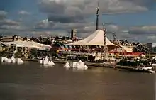 The A$625 million fair was the largest event of the 1988 Bicentennial celebrations of the arrival of the First Fleet in Sydney Harbour.[2][3][4] Expo 88 attracted more than 15,760,000 visitors who bought tickets worth A$175 million.[5] The event achieved both its economic aims and very good attendances, was successfully used to promote Queensland as a tourist destination and it spurred a major re-development at the South Brisbane site.[6] The core feature of the site were the international pavilions.[5] Many of the exposition's sculptures and buildings were retained by various entities around the state and are still in use or on display today.