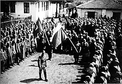 In the freed territories a provisional people's authority was established, led by the National Liberation Committees. Meetings were being held everywhere propagating the causes of the National Liberation Struggle and the right of Macedonians and other nationalities to self-determination. The first schools in which the Macedonian language was taught were created in this free territory in 1943. The whole population, both male and female, was included in the struggle – the men were mobilized in militias and were given short military training and the women were organized in the Women's Antifascist Front of Macedonia).[71][72] In October 1943 the HQ of the People's Liberation Army of Macedonia issued a manifesto to the Macedonian people and all other nationalities in Macedonia (as stated in the manifesto: Aromanians, Albanians and Turks) to join the fight of the Macedonian National Liberation Army to win freedom and create a free Socialist Republic of Macedonia. The manifesto also called for struggle against the reactionary Serbian, Albanian and Bulgarian elements (Chetniks, Balli Kombëtar and IMRO agents).[73]