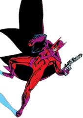 The first Wrath was an enemy of Batman, described by him as his "opposite number".[2] The Wrath's appearance and motivation are reminiscent of Batman's, but with notable differences. The Wrath (like Batman) is distinguished by perfectionism and obsession in what he does. His costume is also very similar to Batman's (though coloured in crimson and purple with a W-insignia on the chest and cowl; the W on his cowl, when seen in the right light and at the right angle, looks like the ears of the Batman's own cowl).