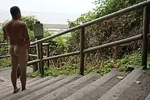 Wreck Beach lies at the base of a cliff; therefore the trails are fairly steep. Trail 6 and Trail 7 both have stairs. Trail 6 includes about 500 wooden steps and is the better developed of the two trails. The path from the Acadia Beach parking lot is the most gentle slope and provides the easiest access to a clothing-optional area. When the tide is not too high, it is possible to walk along the entire shore: from Acadia Beach past the base of Trail 7. Erosion can make the route south of Trail 6 a bit tricky, and it can often be quite muddy.