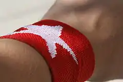 A wrist brace is a supportive garment worn around the wrist to reinforce and protect it against strains and sprains during strong use, or as a splint to help healing.[1] Wrist braces are common accessories in injury rehabilitation processes involving the wrist.[2] They immobilize the joint and provide heat and compression to the wrist bones and ligaments. Currently, they are made with a rigid tissue nylon fabrics[3][4] or neoprene that allows limited mobility of the hand and wrist and are usually fixed with Velcro, some times with extensions to ensure they cover part of the hand adhering around thumb. In severe cases, they incorporate metal "spines" to better immobilize the joint.