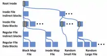 WAFL stores metadata, as well as data, in files; metadata, such as inodes and block maps indicating which blocks in the volume are allocated, are not stored in fixed locations in the file system. The top-level file in a volume is the inode file, which contains the inodes for all other files; the inode for the inode file itself, called the root inode, is stored in a block with a fixed location. An inode for a sufficiently small file contains the file's contents; otherwise, it contains a list of pointers to file data blocks or a list of pointers to indirect blocks containing lists of pointers to file data blocks, and so forth, with as many layers of indirect blocks as are necessary, forming a tree of blocks. All data and metadata blocks in the file system, other than the block containing the root inode, are stored in files in the file system. The root inode can thus be used to locate all of the blocks of all files other than the inode file.[4]