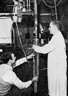 Theoretical physicists Tsung-Dao Lee and Chen-Ning Yang did a literature review on the question of parity conservation in all fundamental interactions. They concluded that in the case of the weak interaction, experimental data neither confirmed nor refuted P-conservation.[5] Shortly after, they approached Chien-Shiung Wu, who was an expert on beta decay spectroscopy, with various ideas for experiments. They settled on the idea of testing the directional properties of beta decay in cobalt-60. Wu realized the potential for a breakthrough experiment and began work in earnest at the end of May 1956, cancelling a planned trip to Geneva and the Far East with her husband, wanting to beat the rest of the physics community to the punch.[6][7] She therefore contacted Henry Boorse and Mark W. Zemansky, who had extensive experience in low-temperature physics. At the behest of Boorse and Zemansky, Wu contacted Ernest Ambler, of the National Bureau of Standards, who arranged for the experiment to be carried out in 1956 at the NBS' low-temperature laboratories.[4] After several months of work overcoming technical difficulties, Wu's team observed an asymmetry indicating parity violation in December 1956.[8]