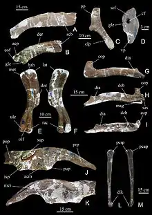Wulagasaurus is based on GMH W184, a partial dentary (toothbearing bone of the lower jaw). Godefroit and colleagues assigned additional remains from the bonebed to their new genus, including three braincases, a cheekbone, two maxillae (the toothbearing bone of the upper jaw), another dentary, two shoulder blades, two sternal elements, two upper arm bones, and an ischium. It can be distinguished from other hadrosaurids by its slender dentary and the unique form of its upper arm, which had distinctive articulations and placements for muscle attachments. Godefroit and colleagues performed a phylogenetic analysis that suggests Wulagasaurus was the most basal saurolophine known (which would result in a long ghost lineage[6]), and interpreted this as evidence that saurolophines and hadrosaurids in general originated in Asia, which has been supported by other finds since.[4] As a hadrosaurid, Wulagasaurus would have been an herbivore.[7]