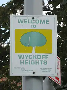 Wyckoff Heights was urbanized starting in the late 19th century, and took its name from the Wyckoff family who owned and farmed much of the land.[1] Development progressed from Brooklyn into Queens as portions of the Wyckoff farm were sold.[2][3] In 1890, newspapers announced the creation of a new park (now Maria Hernandez Park) to be located in Wyckoff Heights, within the 18th Ward of Brooklyn.[4][5] In 1892, Queens County property owners established the Wyckoff Heights Improvement Association to lobby for water, sewer, and gas service to the neighborhood,[6] and the next year, the Wyckoff Heights Water Company was formed to supply drinking water to the area. In 1901 residents of the Queens section lobbied the City government to "adopt a system of house numbering" and erect street signs so that the postal service would begin delivery to the neighborhood.[7] The last 18 acres (73,000 m2) of farmland were developed in the 1940s.[8]