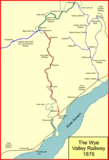 The Wye Valley Railway was a standard gauge railway that ran for nearly 15 miles (24 km) along the Lower Wye Valley between the towns of Chepstow and Monmouth, crossing several times between Wales and England. Opened on 1 November 1876, it was leased to, and worked by, the Great Western Railway (GWR), before being fully absorbed by the GWR in 1905.