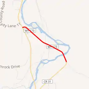 Wyoming Highway 173 begins its west end at US 20/WYO 789 just over a mile and a half south of Thermopolis. Named Buffalo Creek Road, Highway 173 travels southeasterly along the south bank of the Bighorn River. At 1.42 miles, WYO 173 crosses the river via the CQA Four Mile Bridge which is listed on the U.S. National Register of Historic Places as one of forty bridges throughout Wyoming that illustrate steel truss construction.[2] Two-tenths of a mile later WYO 173 reaches its end at County Route 31 (S. Yellowstone Road).[3][4] CR 31 continues another 1.6 miles south and returns to US 20/WYO 789.