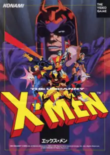 X-Men (エックス・メン) is an arcade game produced by Konami in 1992, a side-scrolling beat 'em up based on the Marvel Comics superhero team of the same name. The character designs of the characters in the game are based on the 1989 cartoon X-Men: Pryde of the X-Men. In the game, up to six players control the X-Men to defeat their archenemy Magneto. The six-player version of the game utilizes two screens housed in a deluxe cabinet.