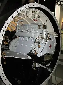 The craft was about 51 ft (16 m) long, 5.5 ft (1.7 m) maximum diameter and displaced 27 long tons (27 t) surfaced and 30 long tons (30 t) submerged. Propulsion was by a 4-cylinder Gardner 4LK[1] 42 hp diesel engine, converted from a type used in London buses and a 30 hp electric motor, giving a maximum surface speed of 6.5 knots (12.0 km/h; 7.5 mph) and a submerged speed of about one third of that.[2] The crew initially numbered three—commander, pilot and ERA (Engine Room Artificer, i.e. engineer), but soon a specialist diver was added, for whom an airlock, known as a "wet and dry" compartment, was provided. The ERA, usually a Navy Chief Petty Officer, operated and maintained the machinery in the vessel.