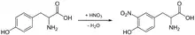 The xanthoproteic reaction is a method that can be used to detect a presence of protein soluble in a solution, using concentrated nitric acid. The test gives a positive result in amino acids carrying aromatic groups, especially in the presence of tyrosine. If the test is positive the proof is neutralized with an alkali, turning dark yellow. The yellow colour is due to xanthoproteic acid which is formed due to nitration of certain amino acids, most common examples being tyrosine and tryptophan.[1] This chemical reaction is a qualitative test, determining the presence or absence of proteins.