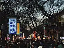 The Xi'an Muslim Quarter (Chinese: 西安回民街) is a very famous snack and commercial street in China. It is situated in the center part of Xi'an, China. It is close to the Bell Tower and the Drum Tower. Shehui Road is to the east, Zaoci Lane to the west, West Avenue to the south, and Hongfu Street to the north.[1] There are ten mosques in the area. The biggest one is the Great Mosque, which was listed as the state-level protected heritage for its traditional buildings and religious significance.[2] According to demographic statistics in 2010, about 60,000 people live in this area, more than half of which are the Huis and the others are the majority Hans.[3] In the past few decades, Xi'an Muslim Quarter has become a well-known tourism site which is famous for its culture and food. It attracts visitors from all over the world each year.