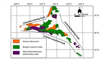 The Xiong'er Volcanic Belt is made up of four geologic formations which include one sedimentary and three volcanic units.[3][4] Starting at the bottom is the sedimentary Daguish formation and above it are the three volcanic formations, which consist of the Xushan, Jidanping, and Majiahe.[1][2][3][4] They unconformibly overlie the Archean to Paleoproterozoic formations which make up the basement rock in the area, and they lie unconformibly below the meso-Neoproterozoic sedimentary rocks, which include sandstones and limestones.[3][4]